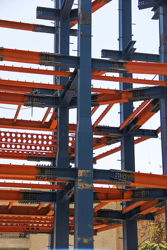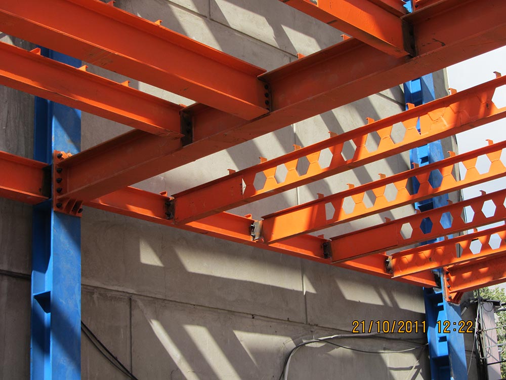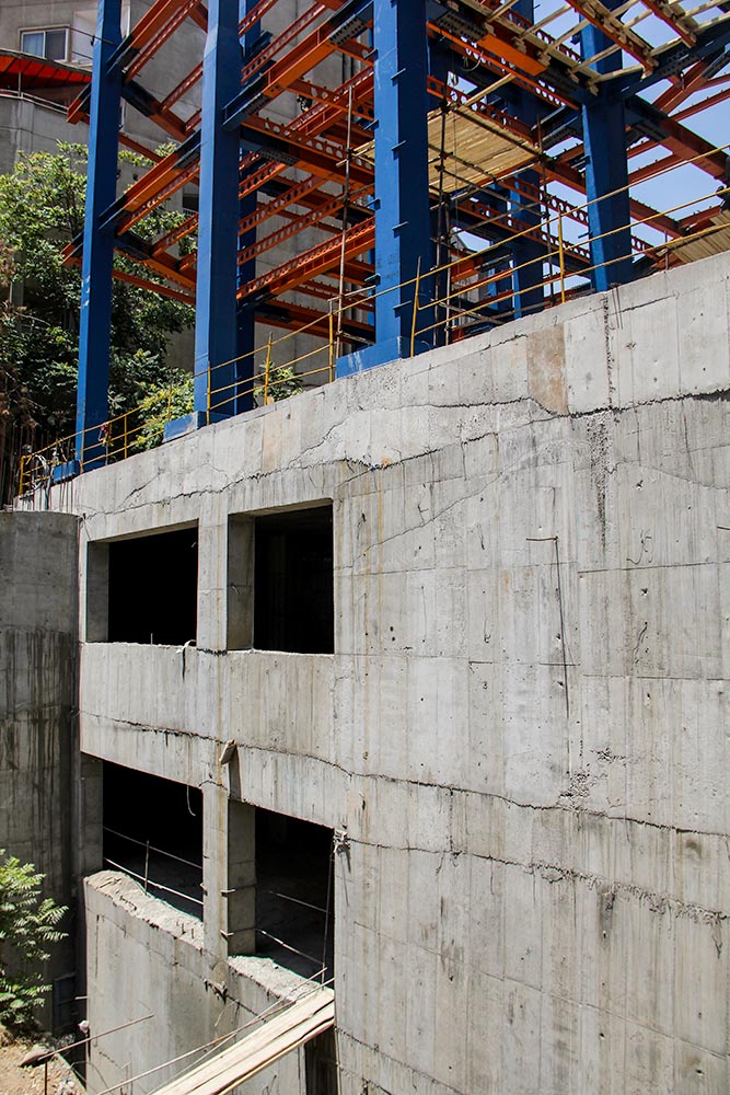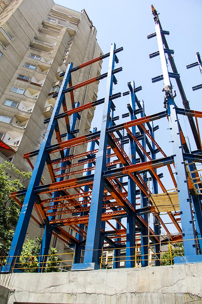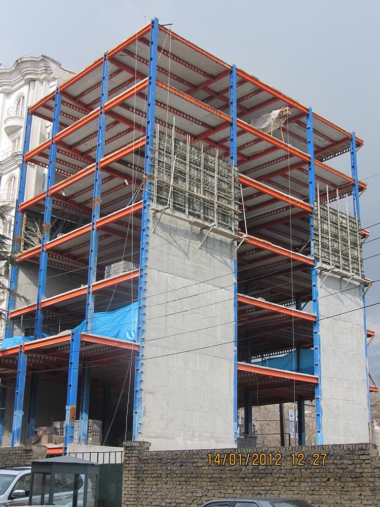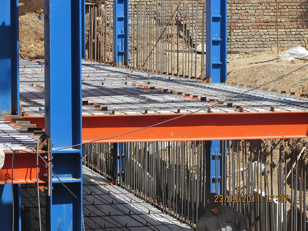 - ویژگی های خاص: بالای همکف اسکلت فلزی زیر همکف اسکلت،استفاده از روسازه فلزی به همراه دال انتقالی بر روی سازه بتنی- استفاده از جداگر لرزهای